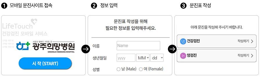 이름, 생년월일, 핸드폰번호를 정확히 입력 후 문진 작성하기 바랍니다.